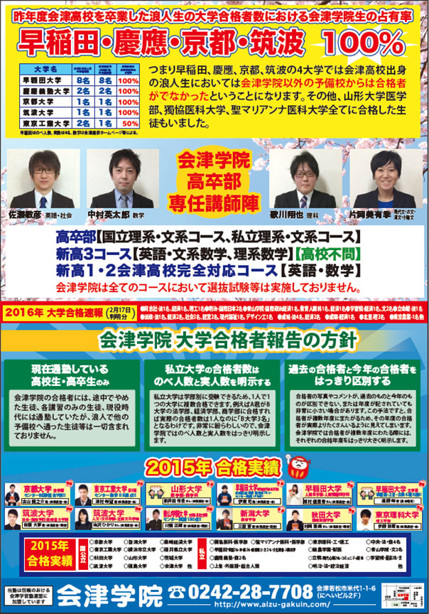 昨年度会津高校を卒業した浪人生の大学合格者数における会津学院生の占有率は、早稲田・慶應・京都・筑波で100%でした!