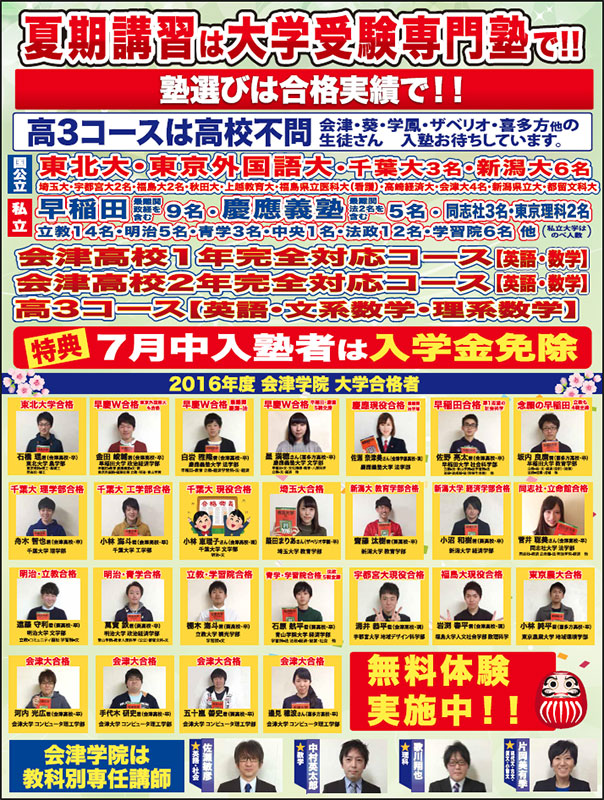 夏期講習は大学受験専門の会津学院で! 2017年2月23日2016年7月11日 7月中の入塾者は入学金免除! 無料体験実施中です!! 授業料・入塾について 授業料や・入塾について、その他ご不明な点がございましたら、 お気軽にお問い合わせください。 0242-28-7708 お問い合わせ・資料請求