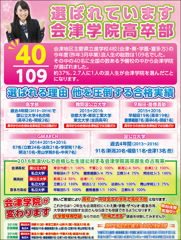 会津学院が選ばれる理由!他を圧倒する合格実績 2017年2月23日2017年2月14日 医学部、難関国公立大学、早稲田・慶應義塾、GMARCH、国公立大学、多数の合格実績があります! 授業料・入塾について 授業料や・入塾について、その他ご不明な点がございましたら、 お気軽にお問い合わせください。 0242-28-7708 お問い合わせ・資料請求