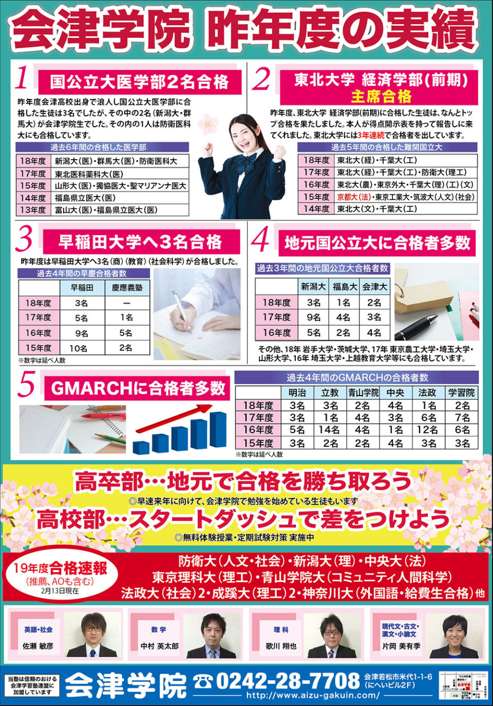 昨年度、会津高校出身で浪人し国公立大医学部に合格した生徒は3名でしたが、その中の2名(新潟大・群馬大)が会津学院生でした。その内の1人は防衛医科大にも合格しています。