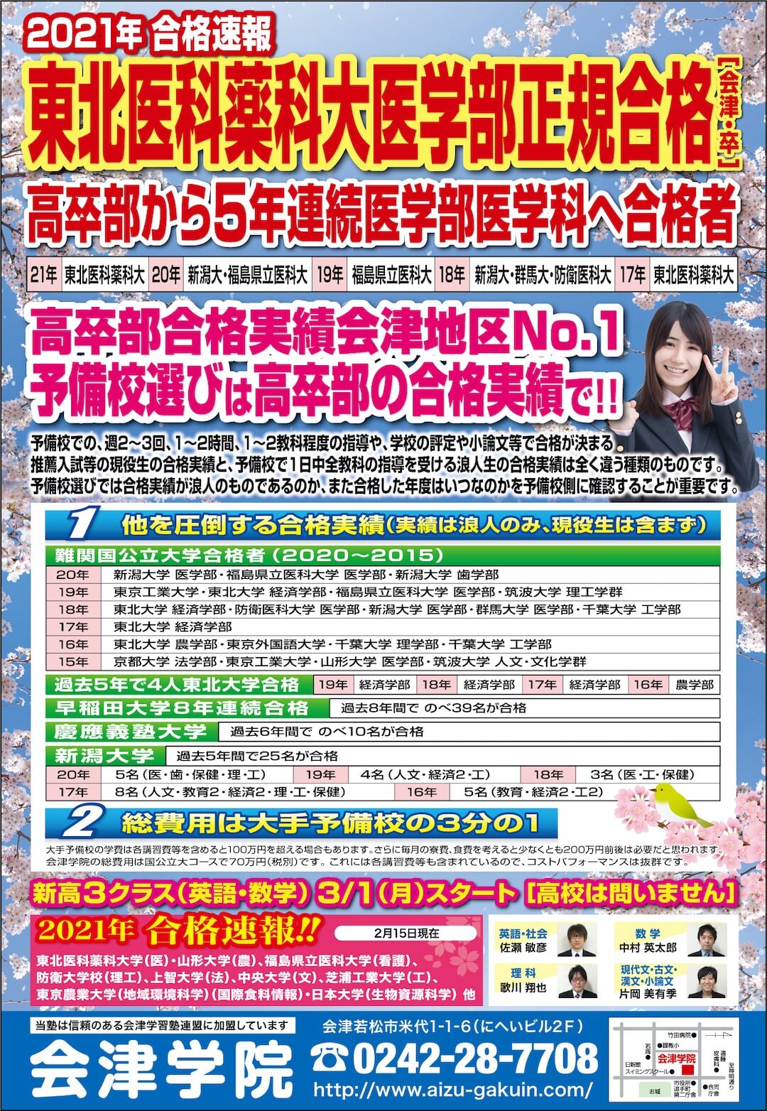 2021年合格速報・高卒部から5年連続医学部医学科へ合格! 2021年2月18日 高卒部から5年連続医学部医学科へ合格! 2月15日現在の合格速報をお知らせします。 ■ 国公立大学 山形大学(農) 福島県立医科大学(看護) 防衛大学校(理工) 他 ■ 私立大学 東北医科薬科大学 医学部 上智大学(法) 中央大学(文) 芝浦工業大学(工) 東京農業大学(地域環境科学)(国際食料情報) 日本大学(生物資源科学) 他 授業料・入塾について 授業料や・入塾について、その他ご不明な点がございましたら、 お気軽にお問い合わせください。 0242-28-7708 お問い合わせ・資料請求